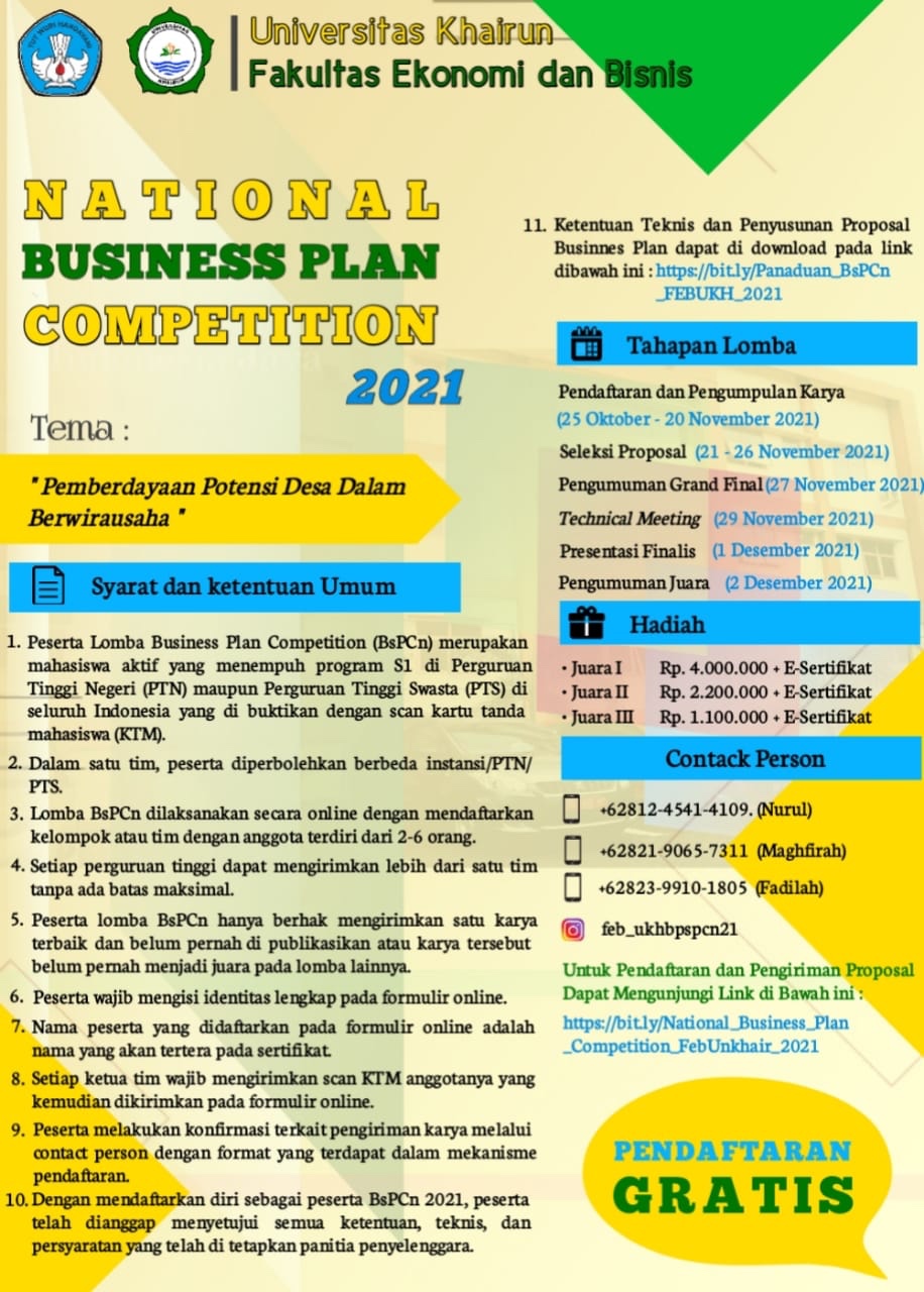 TIMURPOST.com, TERNATE — Dalam rangka menumbuhkan Mahasiswa yang memiliki jiwa entrepreneurship dan mampu berkompetisi secara nasional, maka pada tanggal 21 November s.d 1 Desember 2021 Fakultas ekonomi dan Bisnis akan menyelenggarakan “National Business Plan Competition”.
