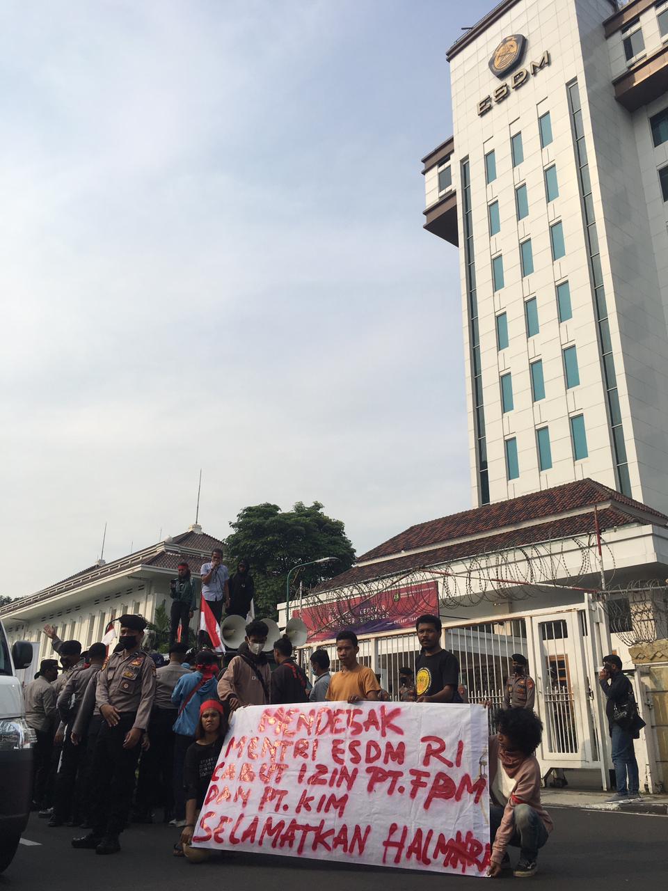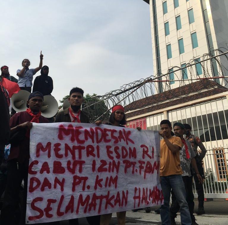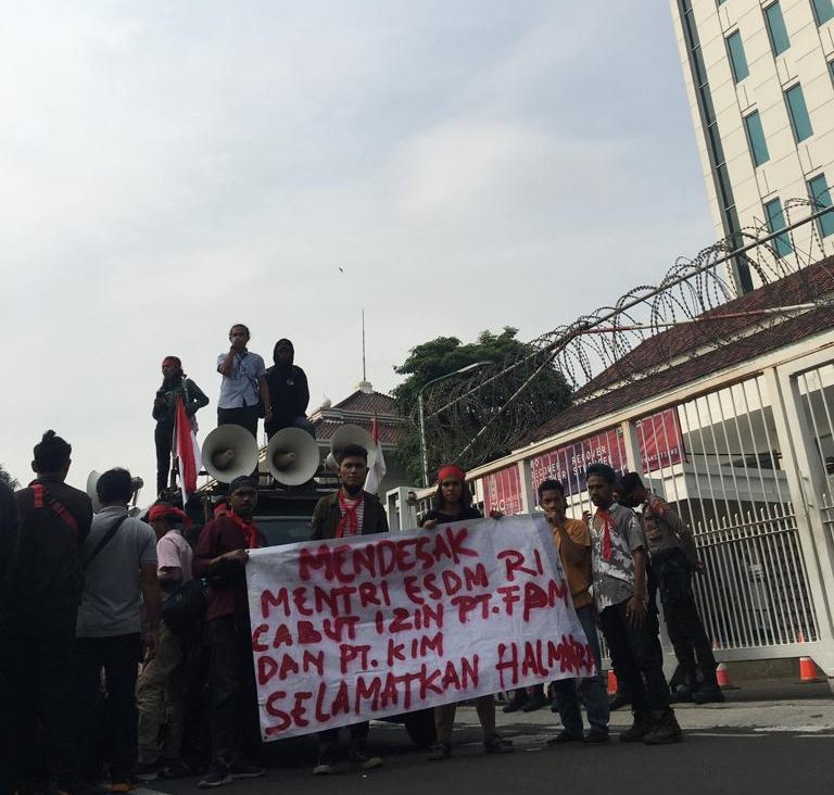 Aksi demonstran yang di lakukan oleh Pengurus Besar Forum Mahasiswa Maluku Utara (PB FORMMALUT) bersama Mahasiswa Maluku dan Maluku Utara. Aktivis mahasiswa jakarta juga desak Kementrian Energi dan Sumber Daya Mineral (ESDM RI) untuk segera mencabut Izin Usaha Pertambangn (IUP) PT. FPM dan IUP PT. KIM yang akan menjadi ancaman Wilaya industri di Maluku Utara.