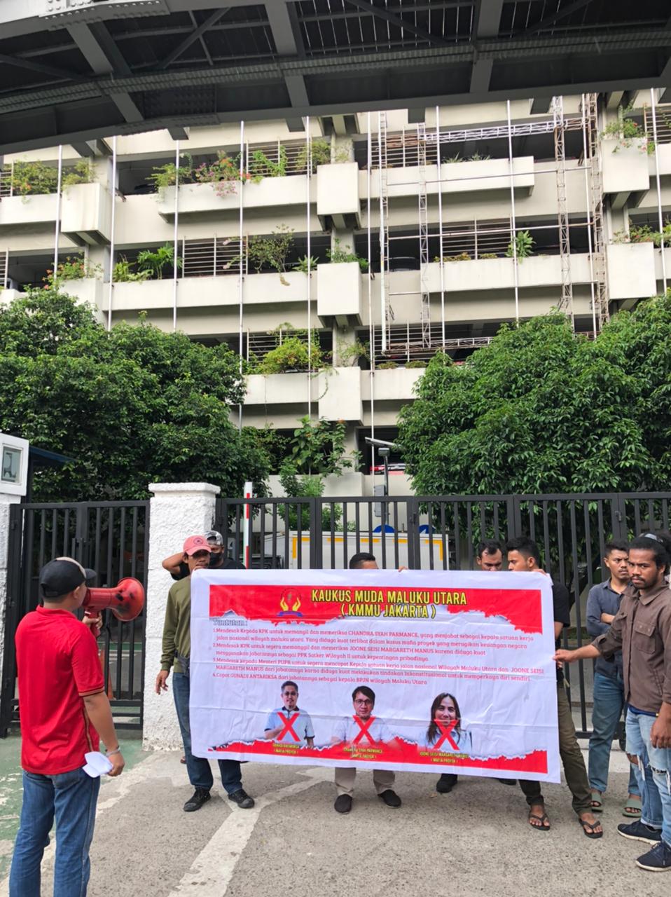 TIMURPOST.com, JAKARTA – Sejumlah Massa yang mengatasnamakan Kaukus Muda Maluku Utara (KKMU Jakarta) kembali mengeruduk gedung Komisi Pemberantasan Korupsi (KPK) dan Kementrian Pekerjaan Umum Perumahan Rakyat (PUPR RI) Siang tadi, pada pukul 01:35-02:35 WIB, di jalan Kuningan Jakarta Selatan dan Jalan Patimura, Kebayoran Baru, Jakarta Selatan.