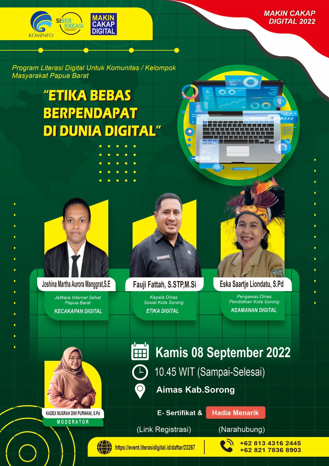 TIMURPOST.com, SORONG — Tim Program Literasi Digital Kementerian Komunikasi dan Informasi Republik Indonesia (Kemenkominfo) berkolabrasi dengan Kampus UNIMUDA -Sorong akan menggelar kegiatan dengan tajuk “Etika Bebas Berpendapat di Dunia Digital”,(08/09/2022).
