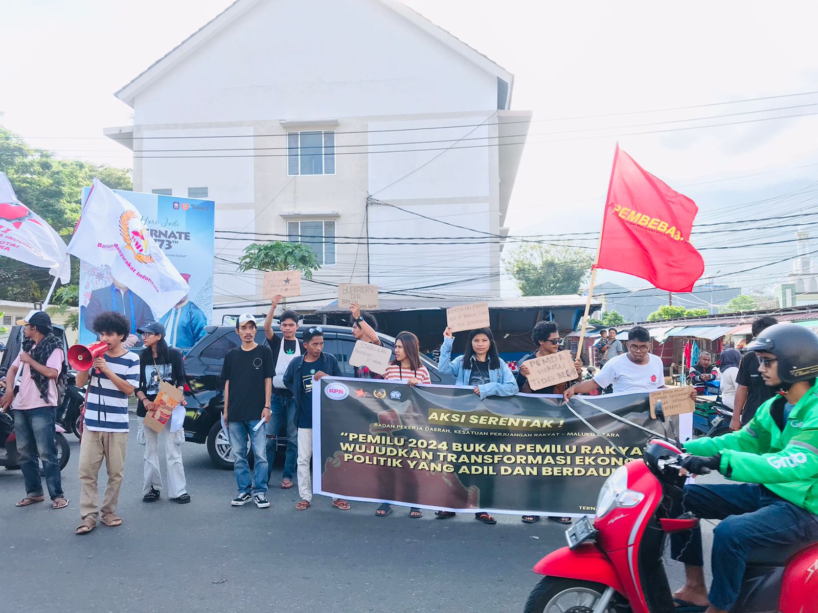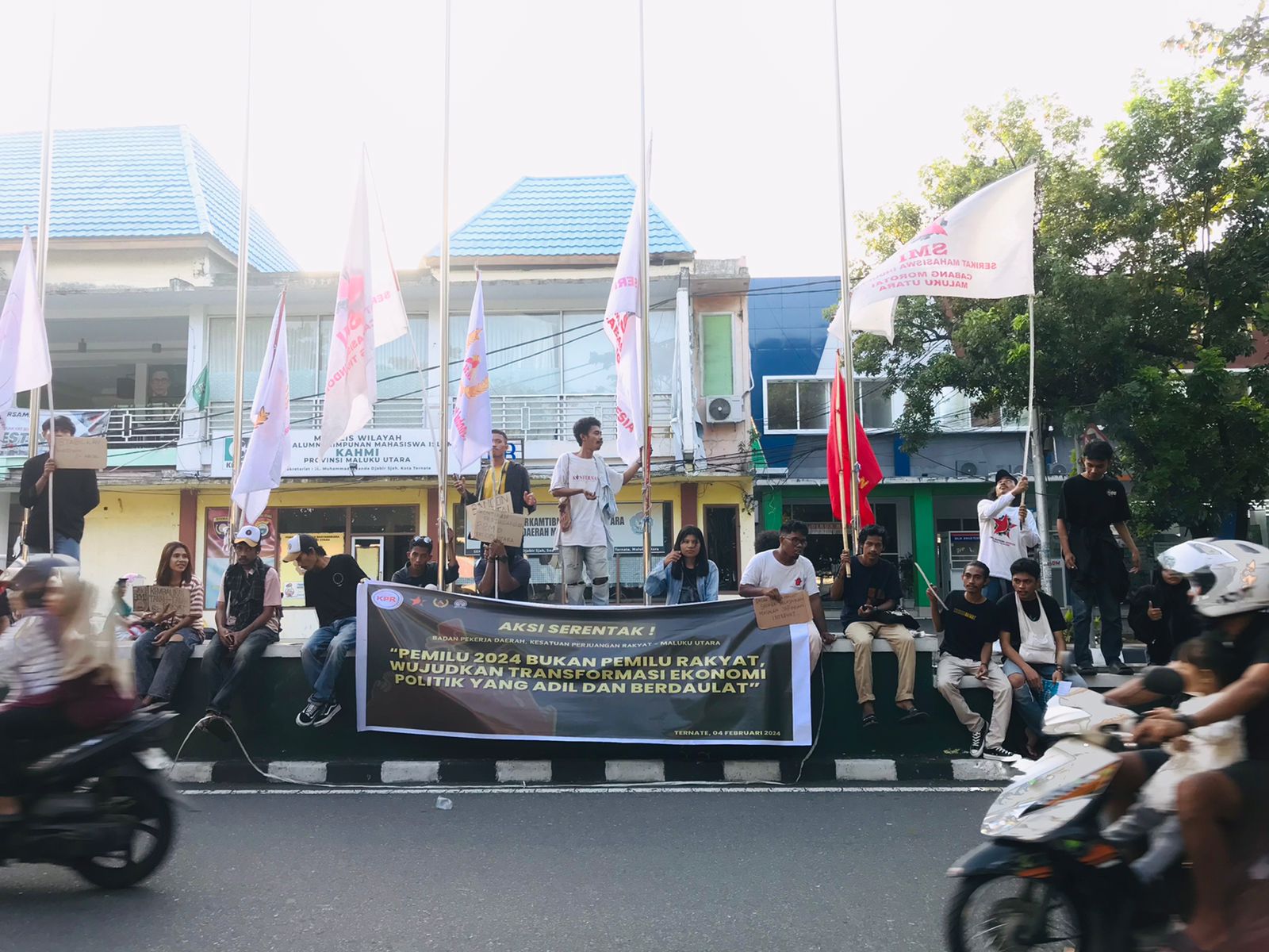 POSTTIMUR.COM, TERNATE–Kesatuan Perjuangan Rakyat (KPR) Maluku Utara, serta solidaritas lainnya, gelar aksi pada minggu, (04/02/024) lalu, Kota Ternate. Aksi ini bertempat di pasar barito serta lanjutannya ditaman nukila, Mereka menyuarakan protes dan menyebut pemelihan umum (Pemilu) 2024 tidak demokratis dan rakyat harus membangun kekuatan alternatifnya sendiri.