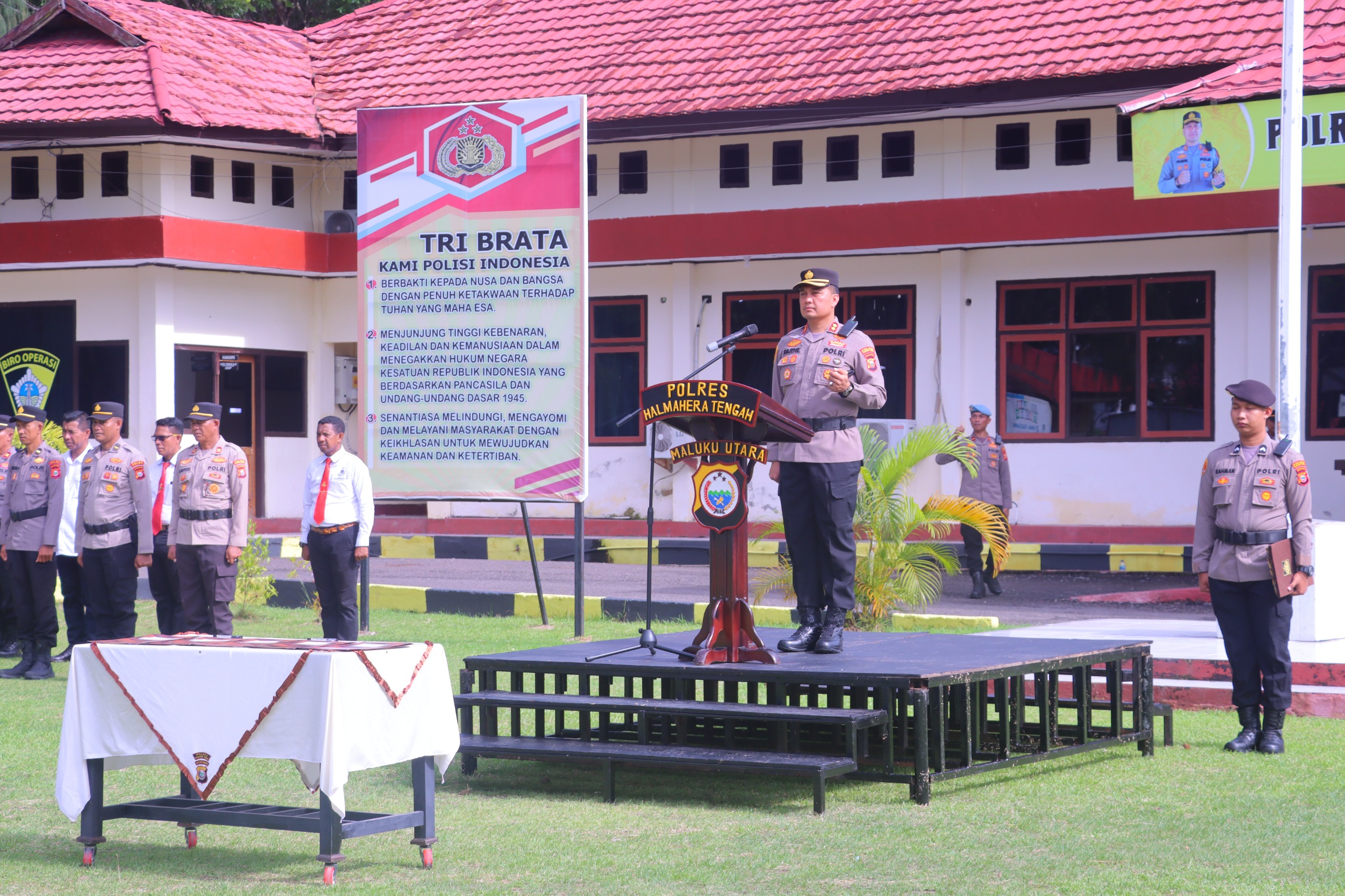 Posttimur.com, Halteng–Kapolres Halteng AKBP Faidil Zikri S.H., S.I.K. memimpin Upacara Serah Terima Jabatan Pejabat Utama KABG OPS ,KABG SDM,KASAT BINMAS,KASAT RESKRIM DAN KASAT INTELKAM Polres Halteng (27/04/2024).
