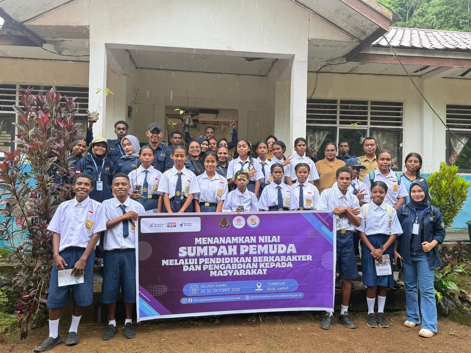 POSTTIMUR.COM, HALTIM_ Dalam semangat memperingati Hari Sumpah Pemuda, mahasiswa Program Studi Ilmu Pemerintahan Angkatan V Universitas Pendidikan Muhammadiyah (UNIMUDA) Sorong melakukan aksi sosial dan pendidikan di Kampung Yenbeser, Distrik Waigeo Selatan, Selasa (29/10/2025).