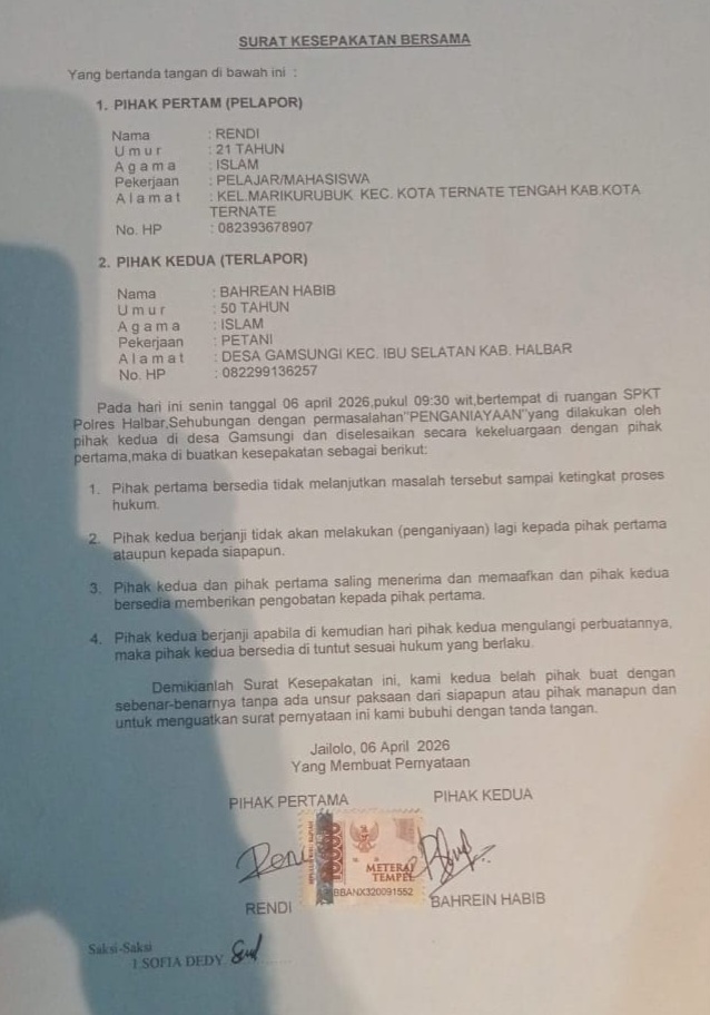 POSTTIMUR.com, HALMAHERA BARAT – Kasus dugaan penganiayaan yang melibatkan Kepala Desa (Kades) Gamsungi, Kecamatan Ibu Selatan, akhirnya berakhir secara damai setelah kedua belah pihak sepakat menyelesaikan persoalan secara kekeluargaan.