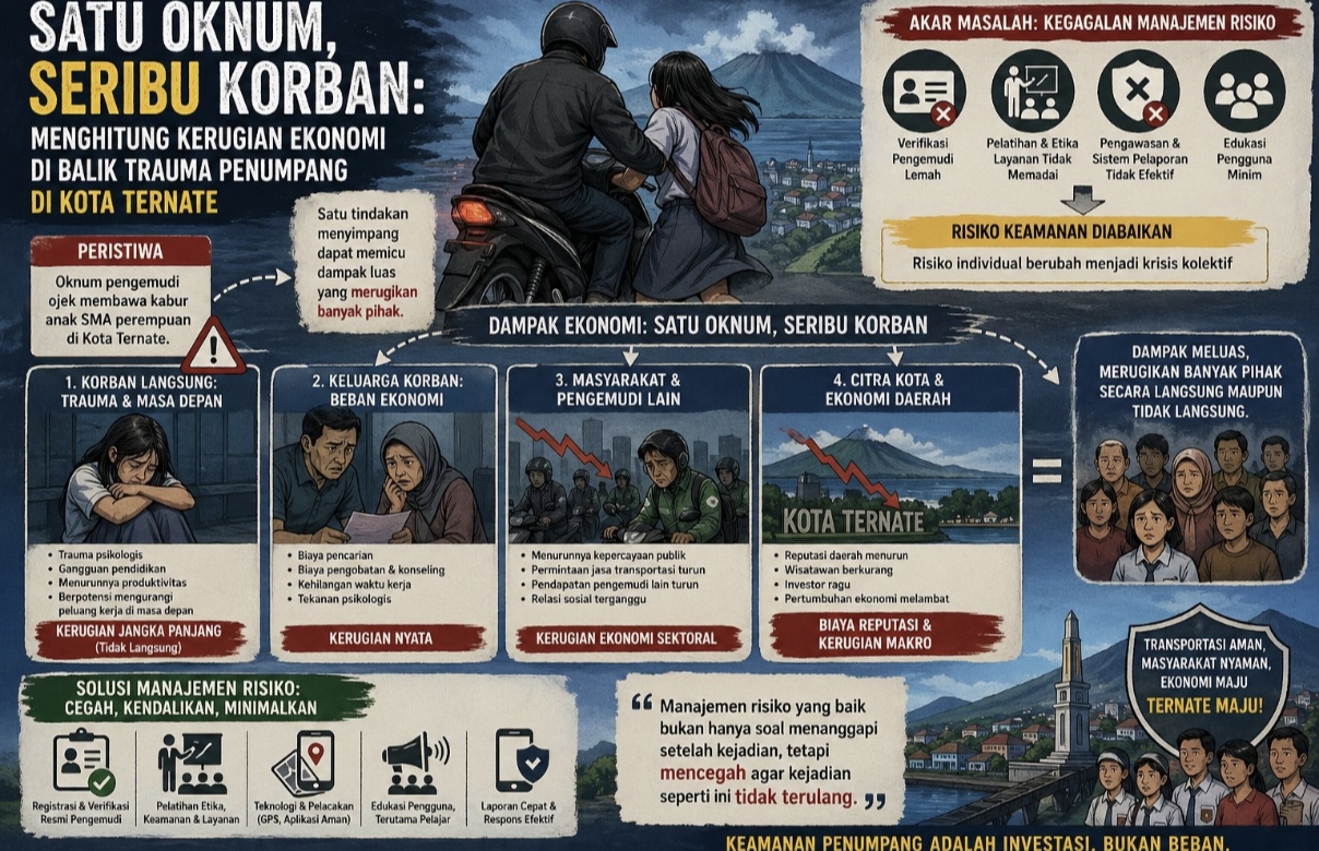 Kasus seorang oknum pengemudi ojek yang diduga membawa kabur seorang siswi SMA di Kota Ternate bukan sekadar persoalan kriminal individual. Peristiwa ini membuka tabir yang lebih luas tentang lemahnya manajemen risiko dalam sektor transportasi informal, serta dampak ekonomi yang kerap luput dari perhatian publik. Satu tindakan menyimpang ternyata mampu menimbulkan efek domino yang merugikan banyak pihak—mulai dari korban, keluarga, pelaku usaha, hingga kepercayaan masyarakat secara keseluruhan.